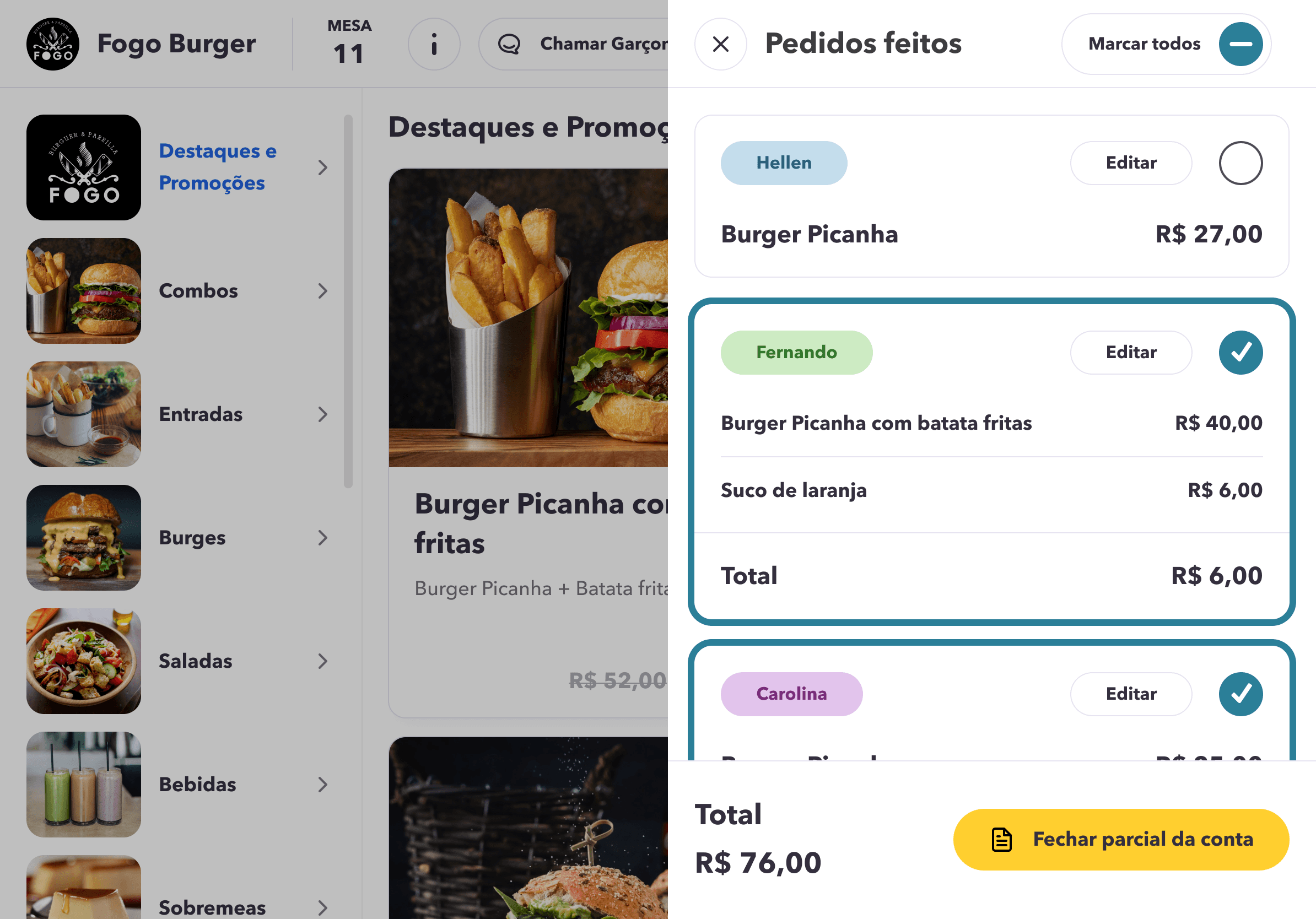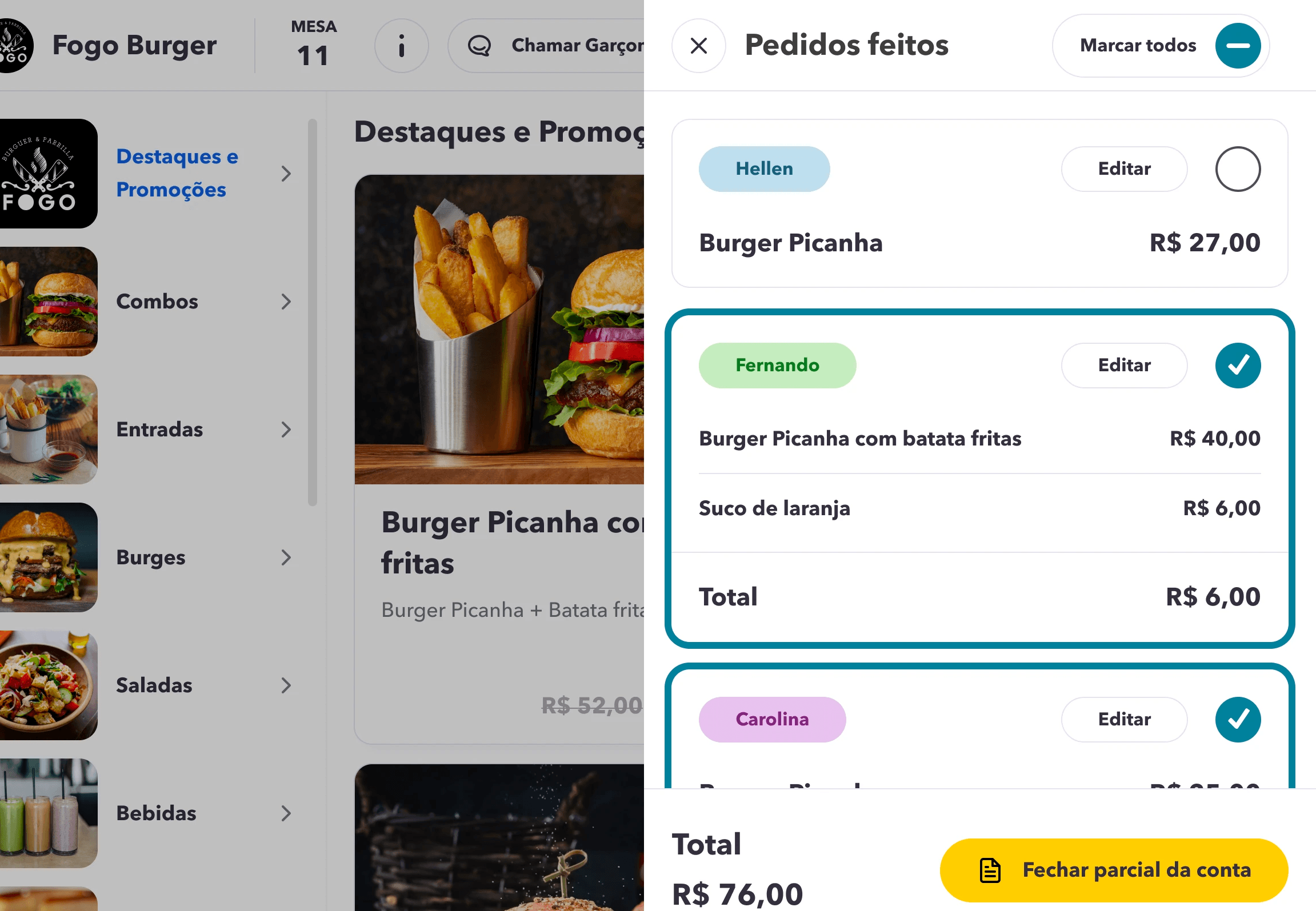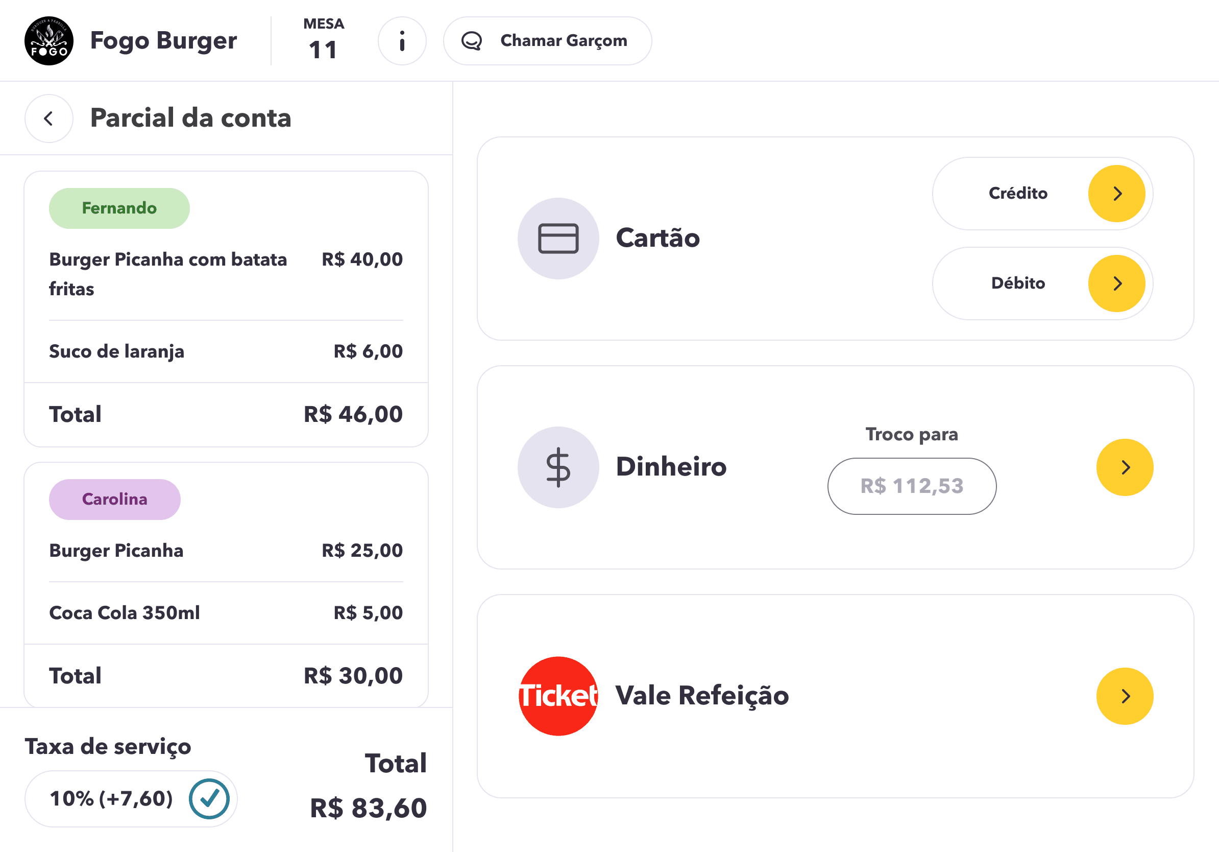 Request the bill, select the person responsible for paying the partial amount, and provide feedback at the end.