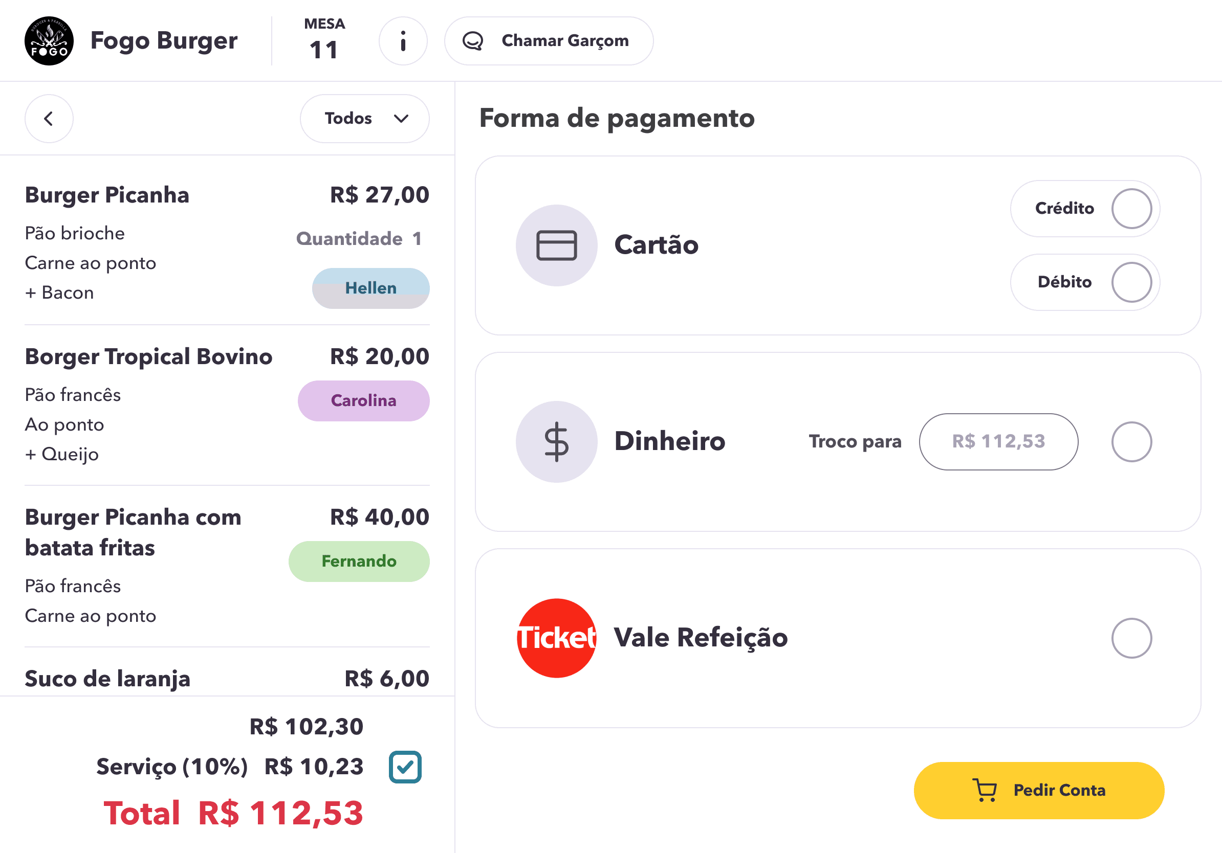 Function designed to identify who placed each order and assist with splitting and paying the total or partial bill.